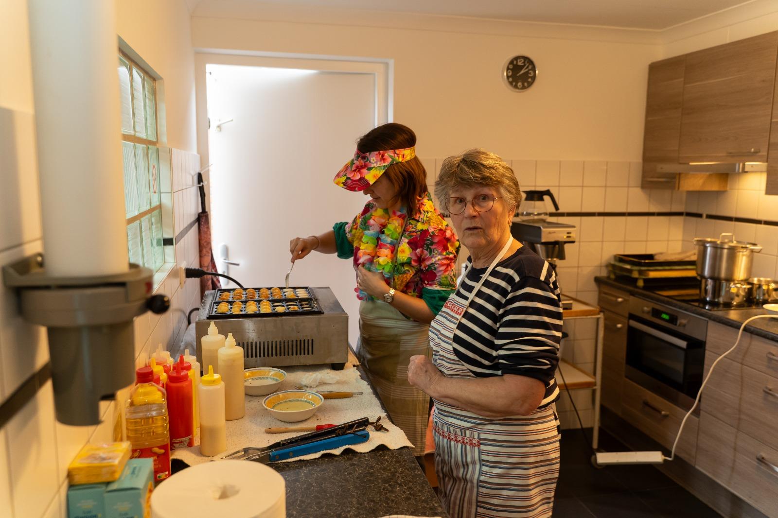 Oma Bets en Jannetje Vermorken voor het bakken voor de heerlijke poffertjes.